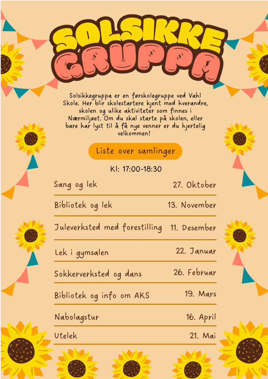 Velkommen til Solsikkegruppa for skolestartere. Alle som skal starte på Vahl skole i august 2026 er velkomne. Publisert: 08.03.2023 Endret: 06.02.2026